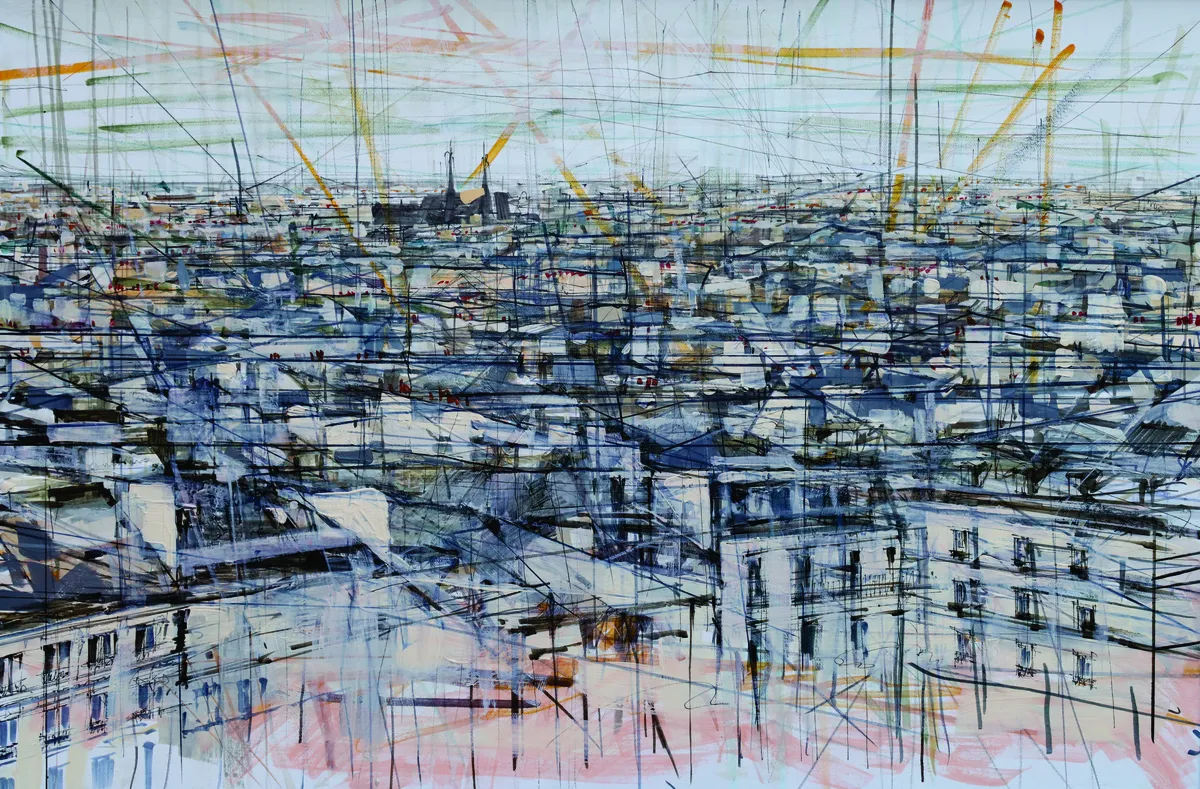 This painting offers a dynamic abstraction of an urban landscape. Layers of intersecting lines, blurred forms, and splashes of color evoke the density and complexity of city life. Architectural structures dissolve into energetic gestures, suggesting movement, noise, and the invisible networks that connect people and places. Subtle warm tones peek through the dominant grays and blues, adding a sense of human presence amidst the structured chaos. It’s a visual exploration of the tension between order and spontaneity in contemporary urban spaces.