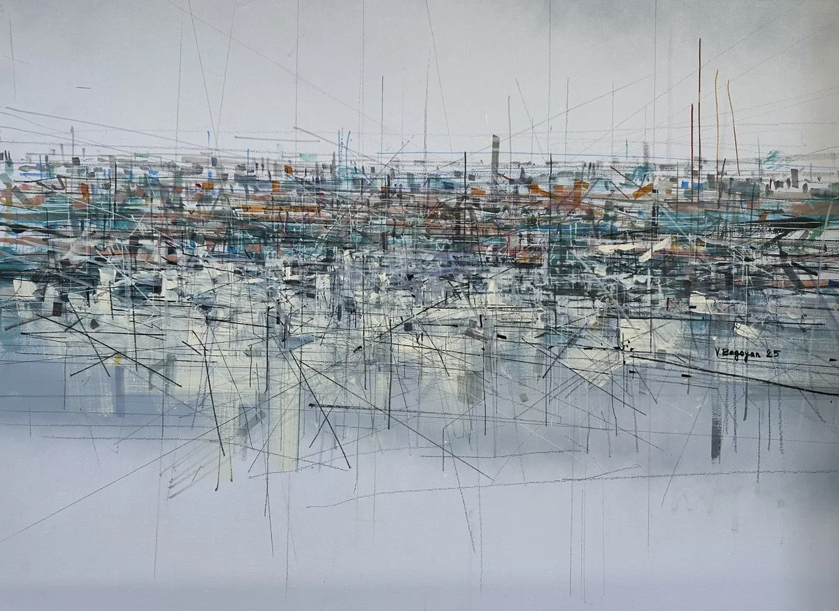 This painting depicts a megalithic stone with a circular hole at its center, standing in an open, ancient landscape. Likely inspired by the Armenian site of Karahunj (Zorats Karer), the scene evokes a sacred connection between earth and cosmos. The central stone becomes a silent observer — its eye-like hole revealing the sky and distant horizon. Its textured surface, covered in lichen and subtle cosmic dust, blurs the line between matter and mystery. Scattered stones and grasses populate the field, while clouds drift in the background, adding to the timeless atmosphere.