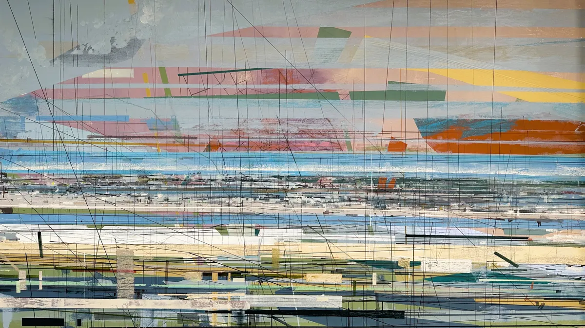 “Horizon of Urban Force” explores the city as a dynamic field of tension between structure and atmosphere. The composition unfolds horizontally, echoing the spatial rhythm of expanding urban territories. Layered bands of color suggest architectural strata, shifting light, and distant horizons, while intersecting linear elements introduce a sense of construction, mapping, and invisible urban energy flows. The painting balances calm expanses with dense structural intersections, reflecting the dual nature of contemporary cities — both ordered and unpredictable. Through abstraction, the work captures not a specific place, but the psychological presence of the city: its expansion, pressure, movement, and quiet intensity.
