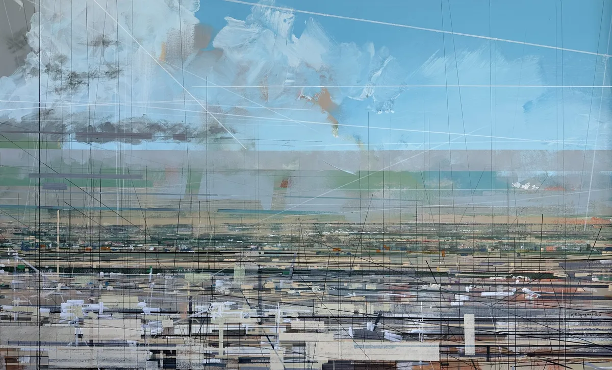 “Horizon of Urban Force” explores the city as a dynamic field of tension between structure and atmosphere. The composition unfolds horizontally, echoing the spatial rhythm of expanding urban territories. Layered bands of color suggest architectural strata, shifting light, and distant horizons, while intersecting linear elements introduce a sense of construction, mapping, and invisible urban energy flows. The painting balances calm expanses with dense structural intersections, reflecting the dual nature of contemporary cities — both ordered and unpredictable. Through abstraction, the work captures not a specific place, but the psychological presence of the city: its expansion, pressure, movement, and quiet intensity.